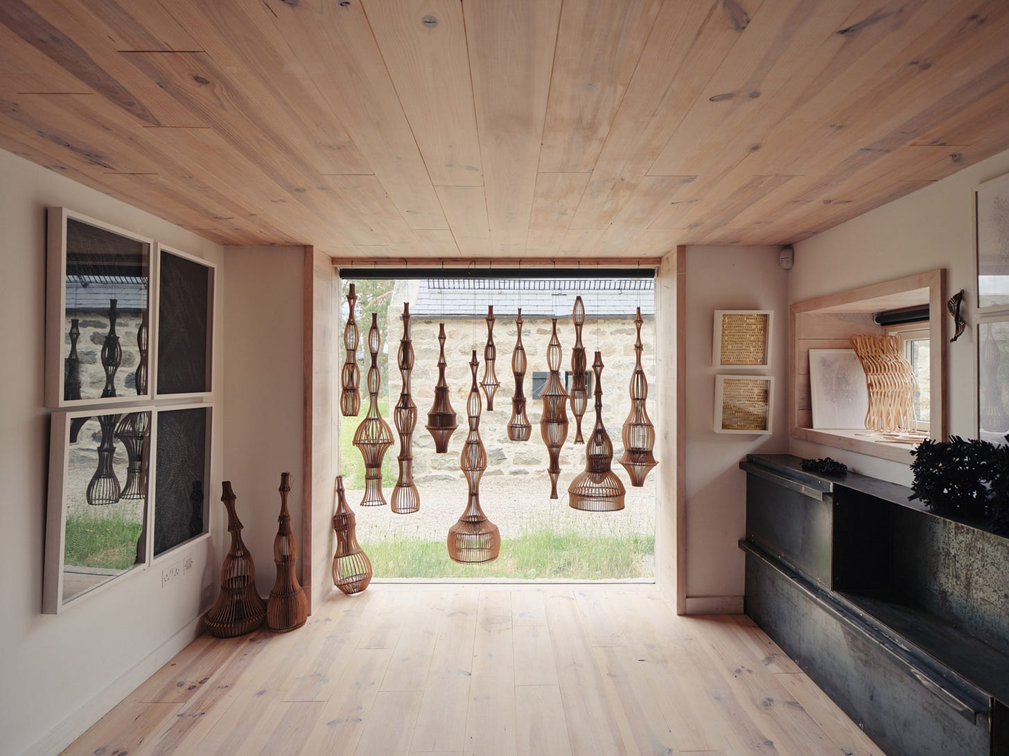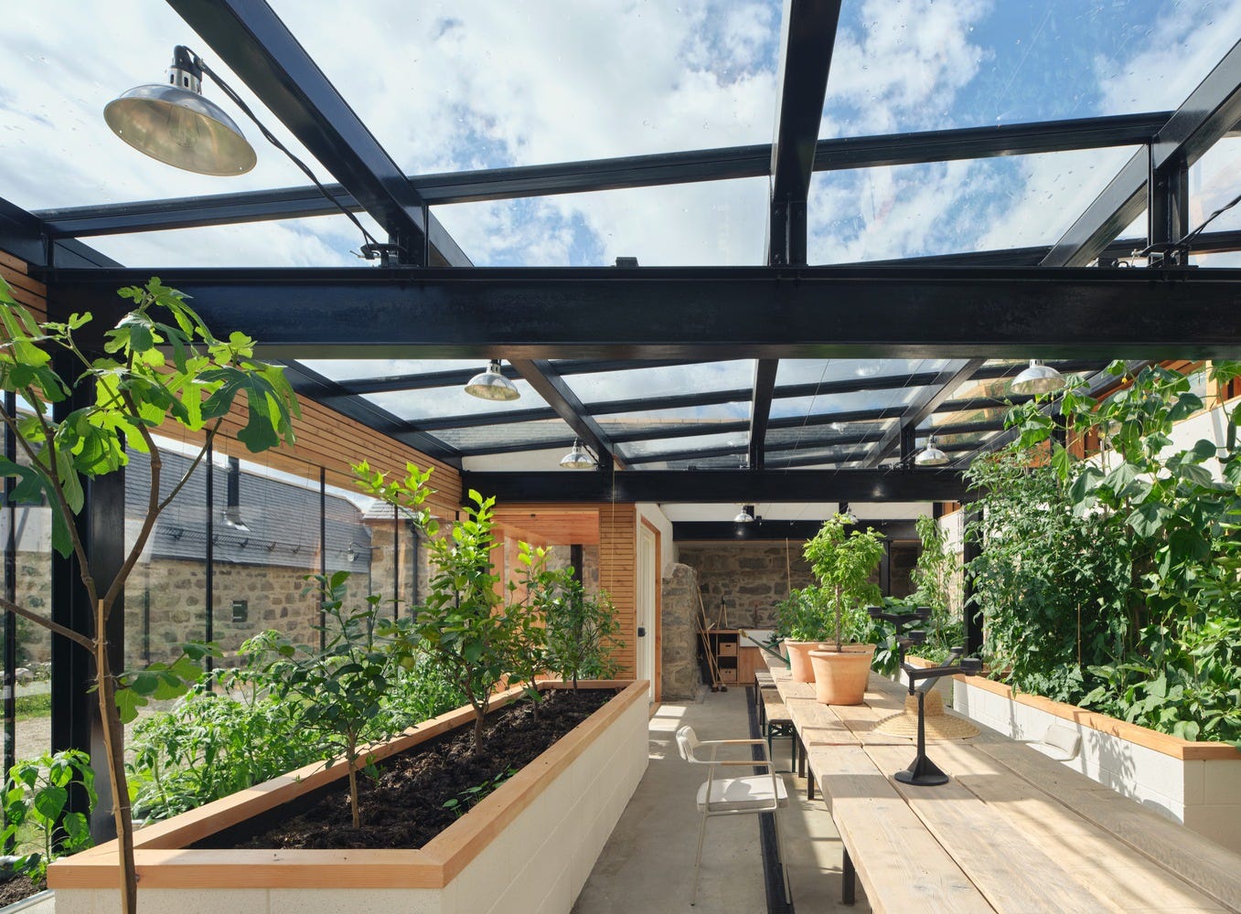 Across the property, a collapsed farm store and sheep pen was meticulously readapted to be a glasshouse, designed in collaboration with the artist/architect owners, joiners Jacek and Waldi Zapała, and steelwork fabricator Craig Monteith.