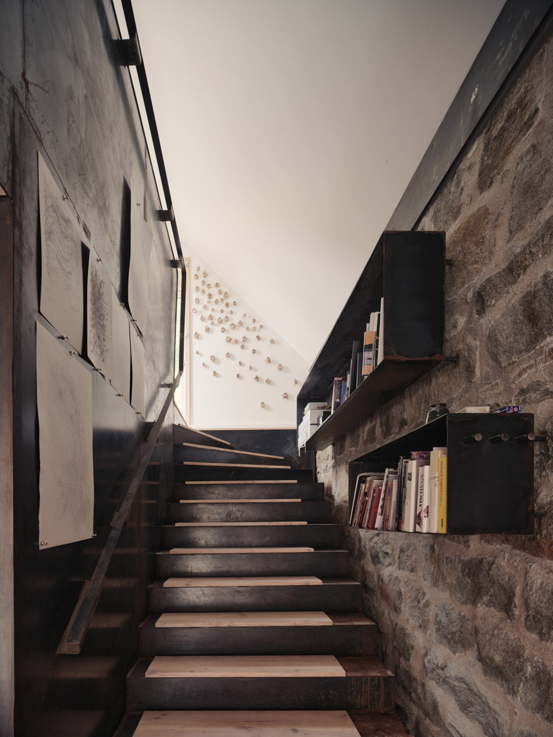 The original, partially-collapsed 19th-century cattle shed was rebuilt to preserve its detail and form — the roof was rebuilt with “newly rationalized pyramidal geometry,” and its walls were lined with clay plaster. (I’ll admit I’m a sucker for texture.)