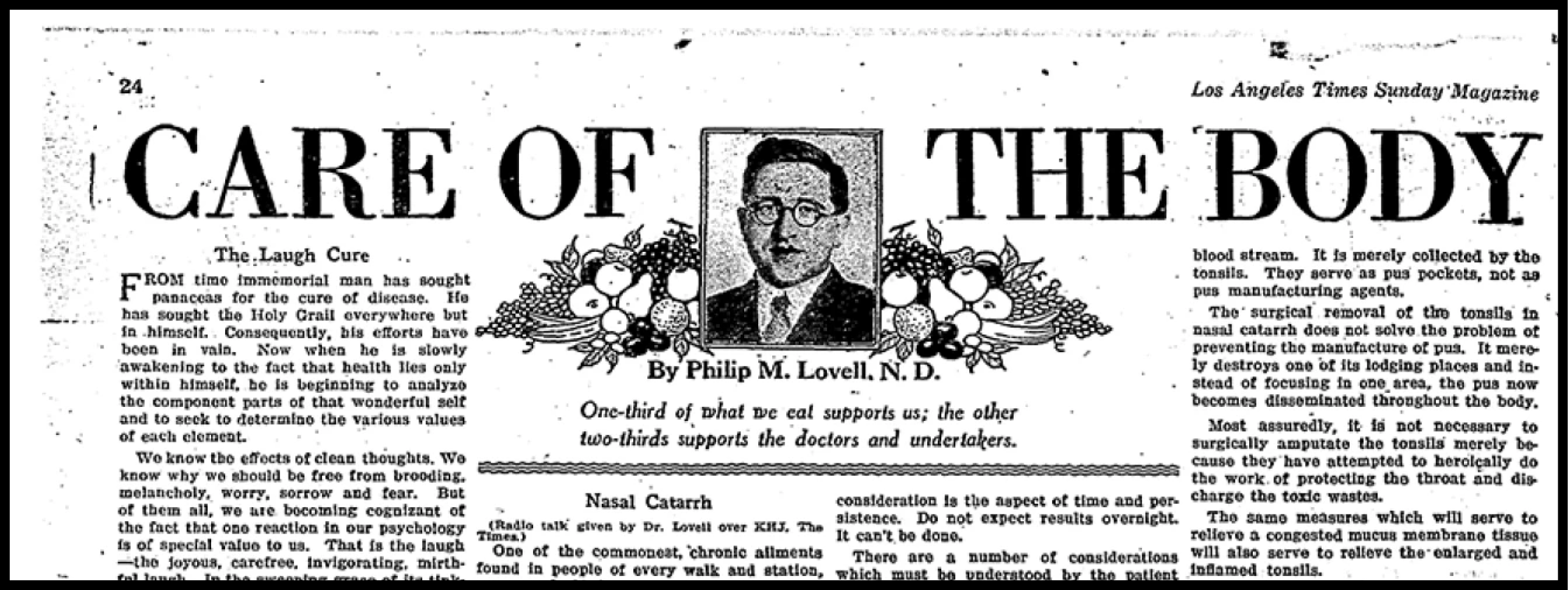 Lovell immersed himself in the world of homeopathic medicine and healthy living after quitting his desk job in Manhattan. He moved to Los Angeles to start his practice and became something of a guru — he wrote sermons, published meat-free recipes, practiced a strict raw-food diet, and promoted the benefits of activities like cold showers, and nude sunbathing.