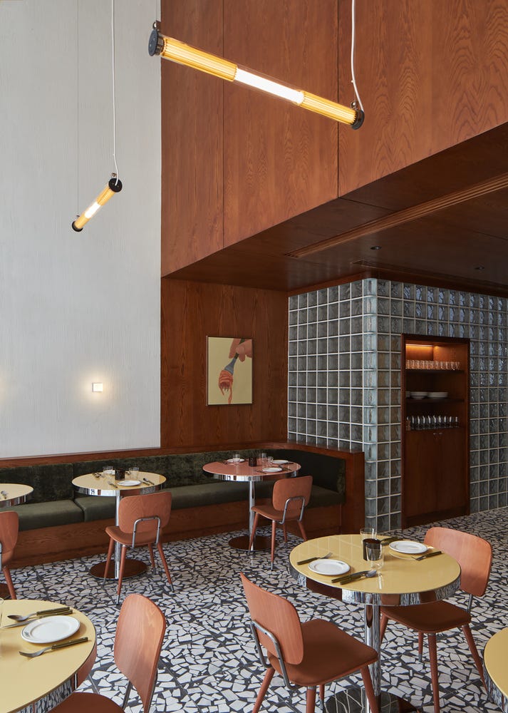 Juno Restaurant blends Italian restaurant and American diner, featuring bi-fold windows and a sun-drenched facade. We love a Terrazzo Marble moment, especially when blended with colorful tabletops for a playful, cozy environment.